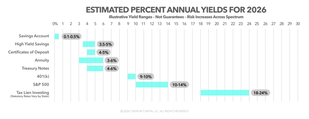 Before we ask an investor to allocate capital into a 506(b), 506(c), or Reg CF offering, we walk them through something most sponsors skip: the alternatives. From insured savings accounts at 0.01–0.50% to tax lien strategies targeting 18–24%, capital lives on a spectrum. At Overlap Capital, we publish that spectrum first—because informed capital compounds better than rushed capital.
